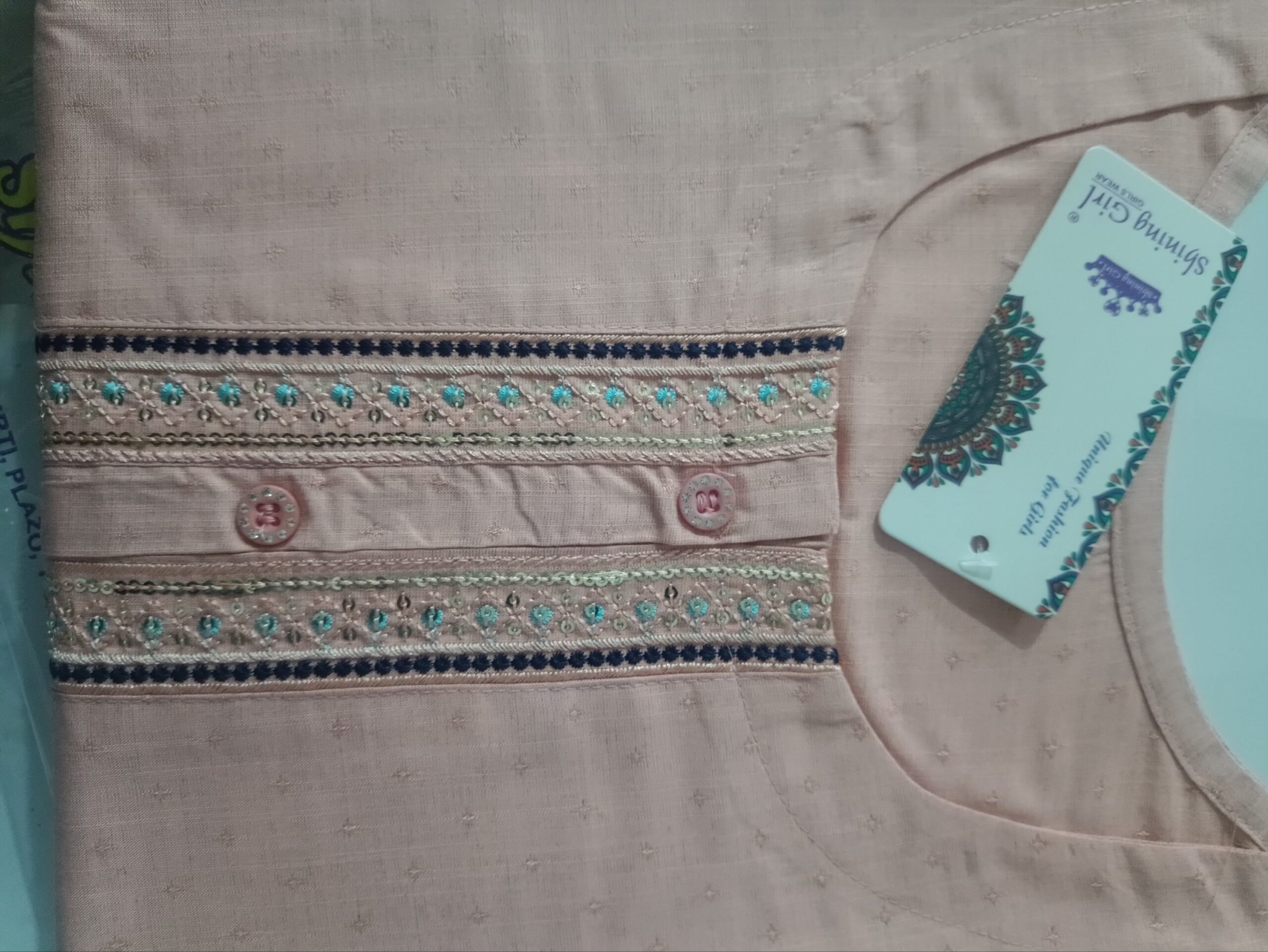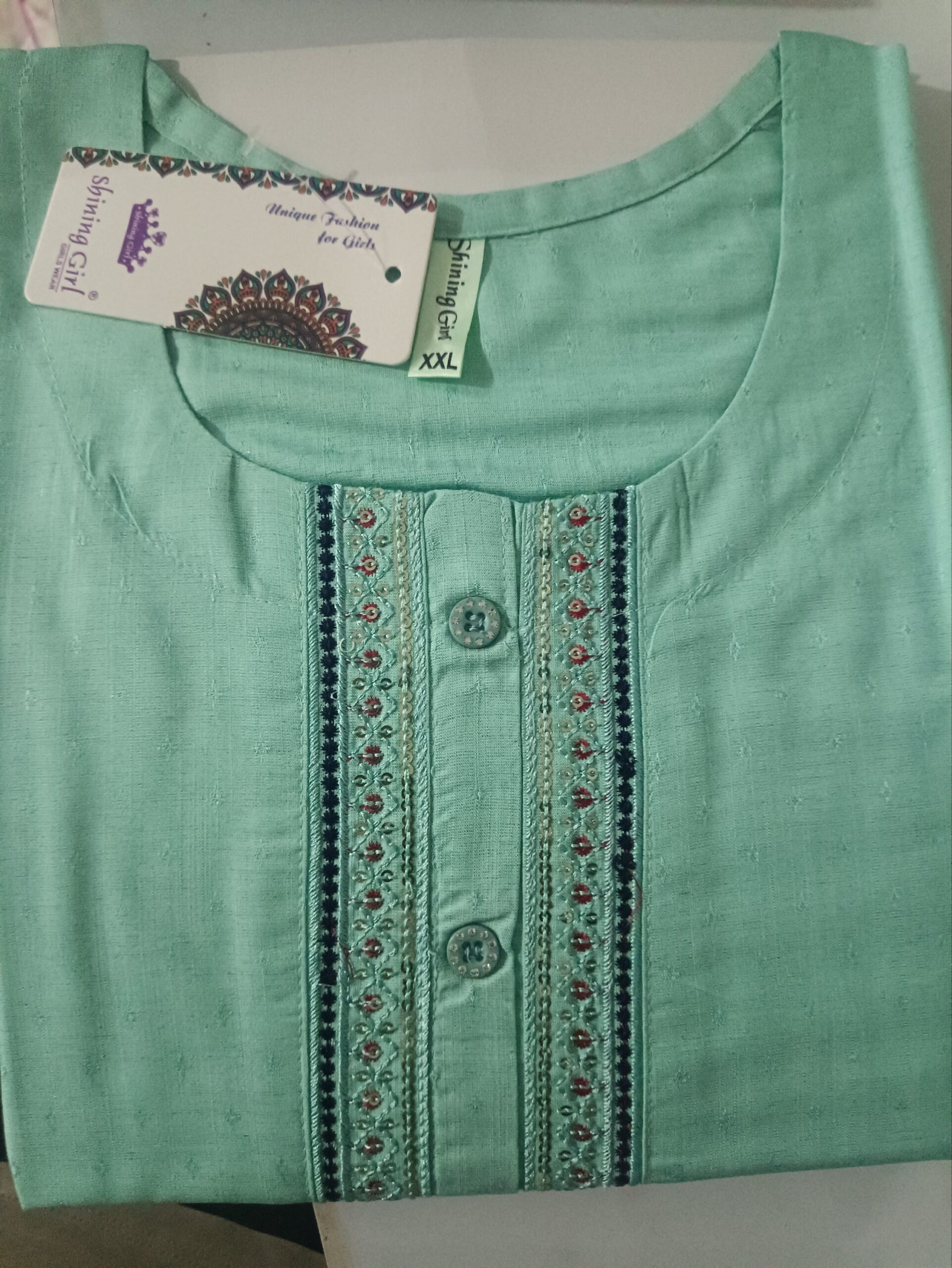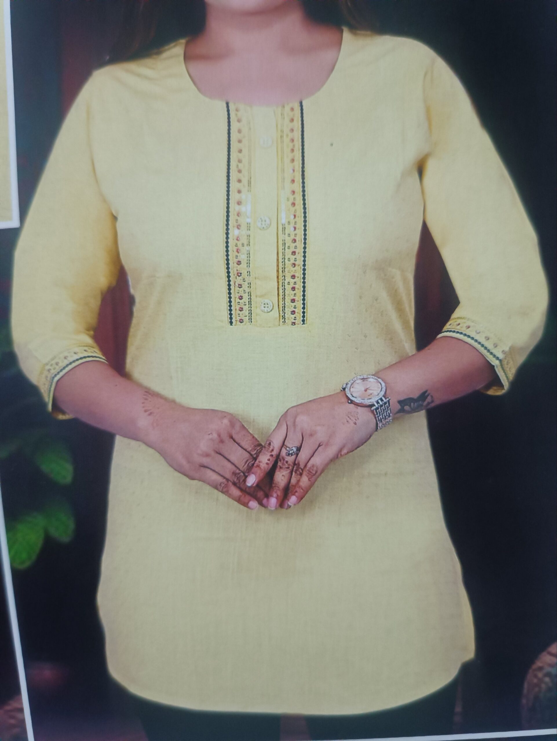 Elevate your everyday style with this beautiful light yellow cotton kurti. Featuring intricate black and maroon thread embroidery along the front yoke and cuffs, this tunic offers a perfect blend of comfort and elegance. The three-quarter sleeves and soft, breathable cotton fabric make it ideal for casual wear, office, or college. A must-have for a refreshing, effortless look!