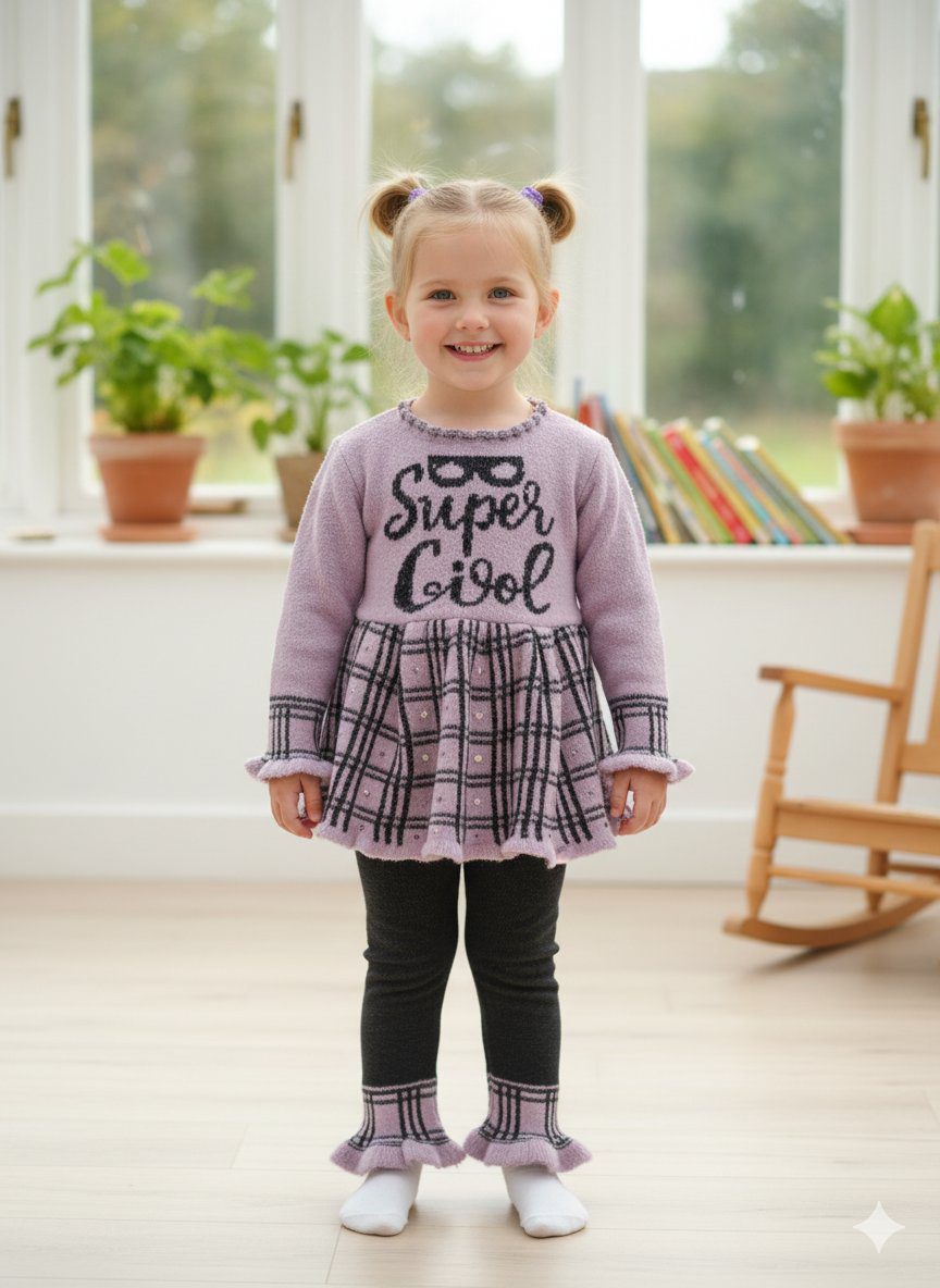 A delightful image featuring a happy young girl wearing a warm, long-sleeved knitted outfit, perfect for cooler weather. The main piece is a lilac sweater tunic with a cheerful, playful design.