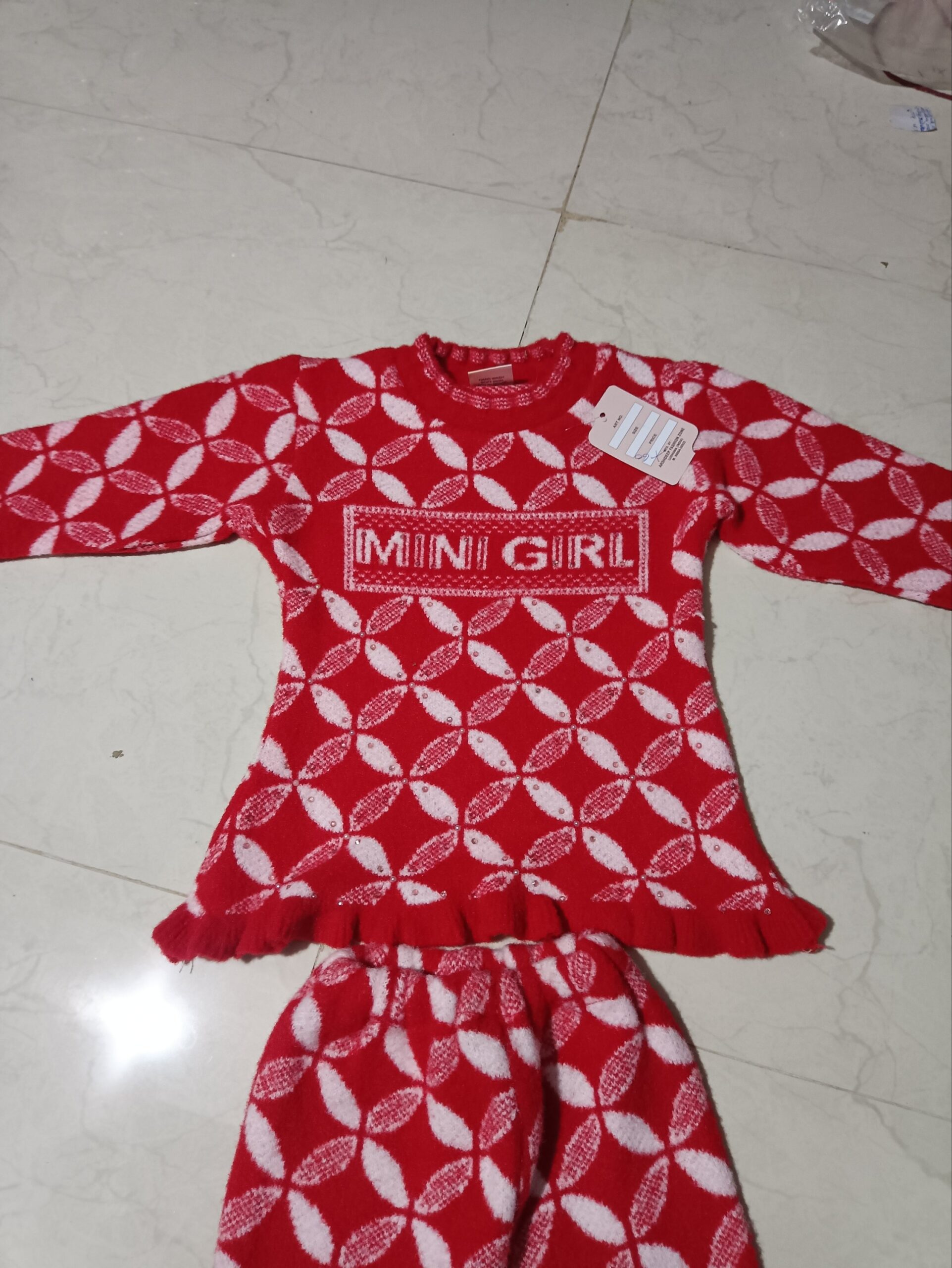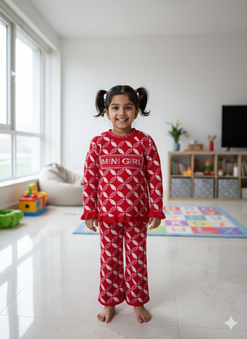 red and white knit pajama set! Featuring a playful repeating pattern and the “MINI GIRL” text, this soft loungewear is perfect for cozy nights or playtime. Ideal for toddlers, this matching top and bottom outfit is a cute and snug addition to any child’s wardrobe.