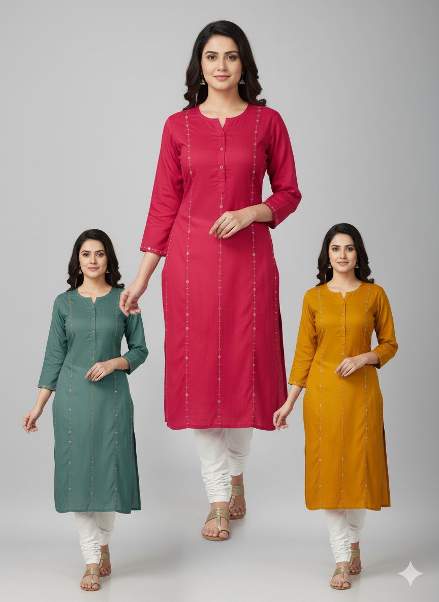 Upgrade your ethnic wardrobe with this stunning set of 3 rayon kurtis! Featuring elegant embroidery, a comfortable straight fit, and 3 rich colors—Pink/Fuchsia, Teal/Sea Green, and Mustard Yellow. Perfect for daily wear, office, or casual outings. Get premium style and comfort in one convenient combo!