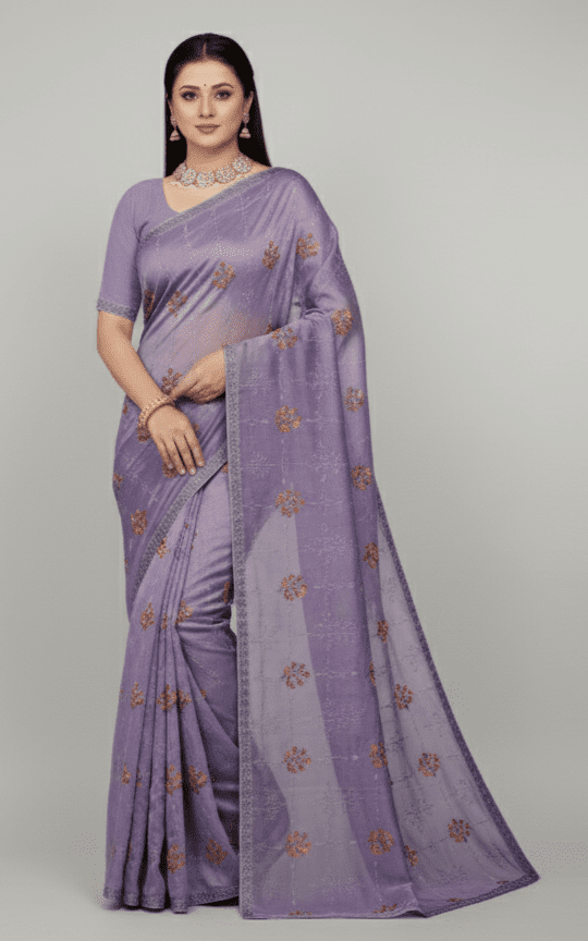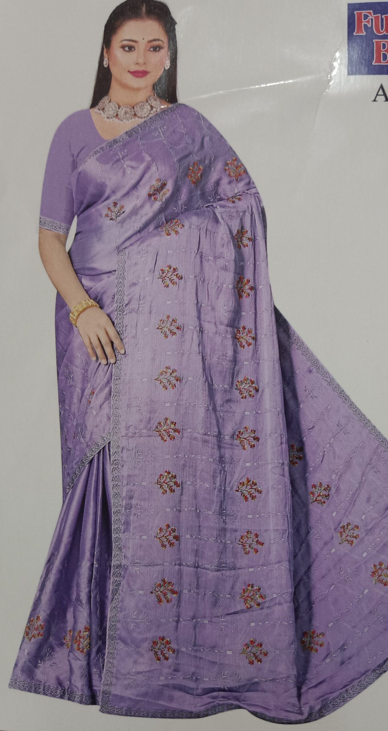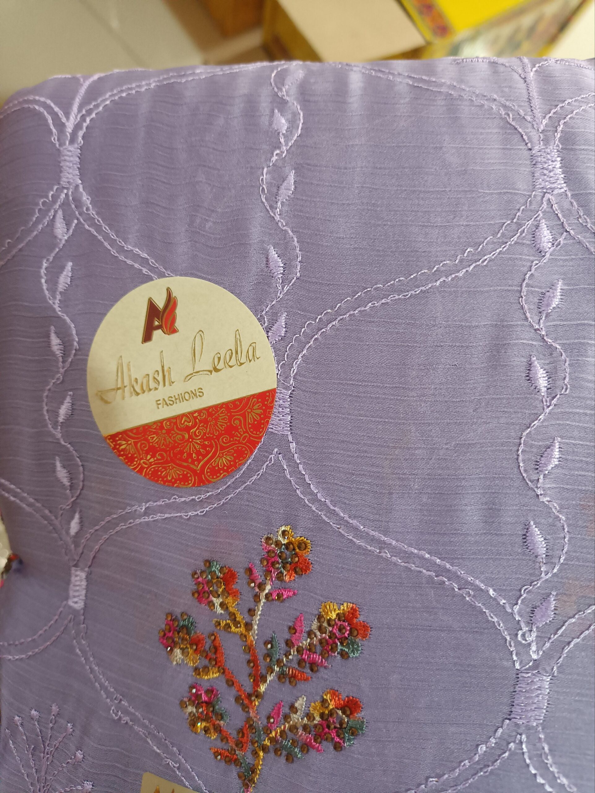 Discover the exquisite beauty of this lavender saree from Akash Leela Fashions, featuring delicate embroidery and a full lace border. Perfect for special occasions, this saree combines traditional charm with a modern, elegant look.