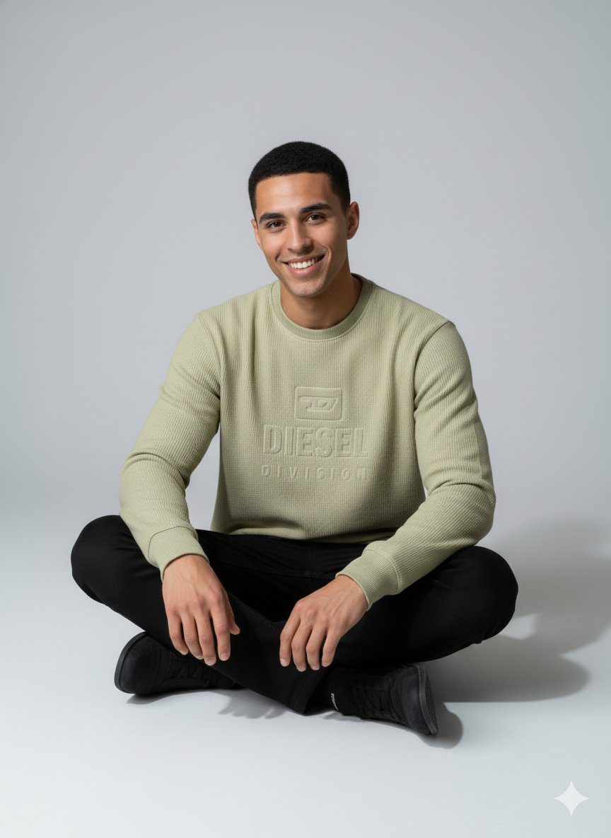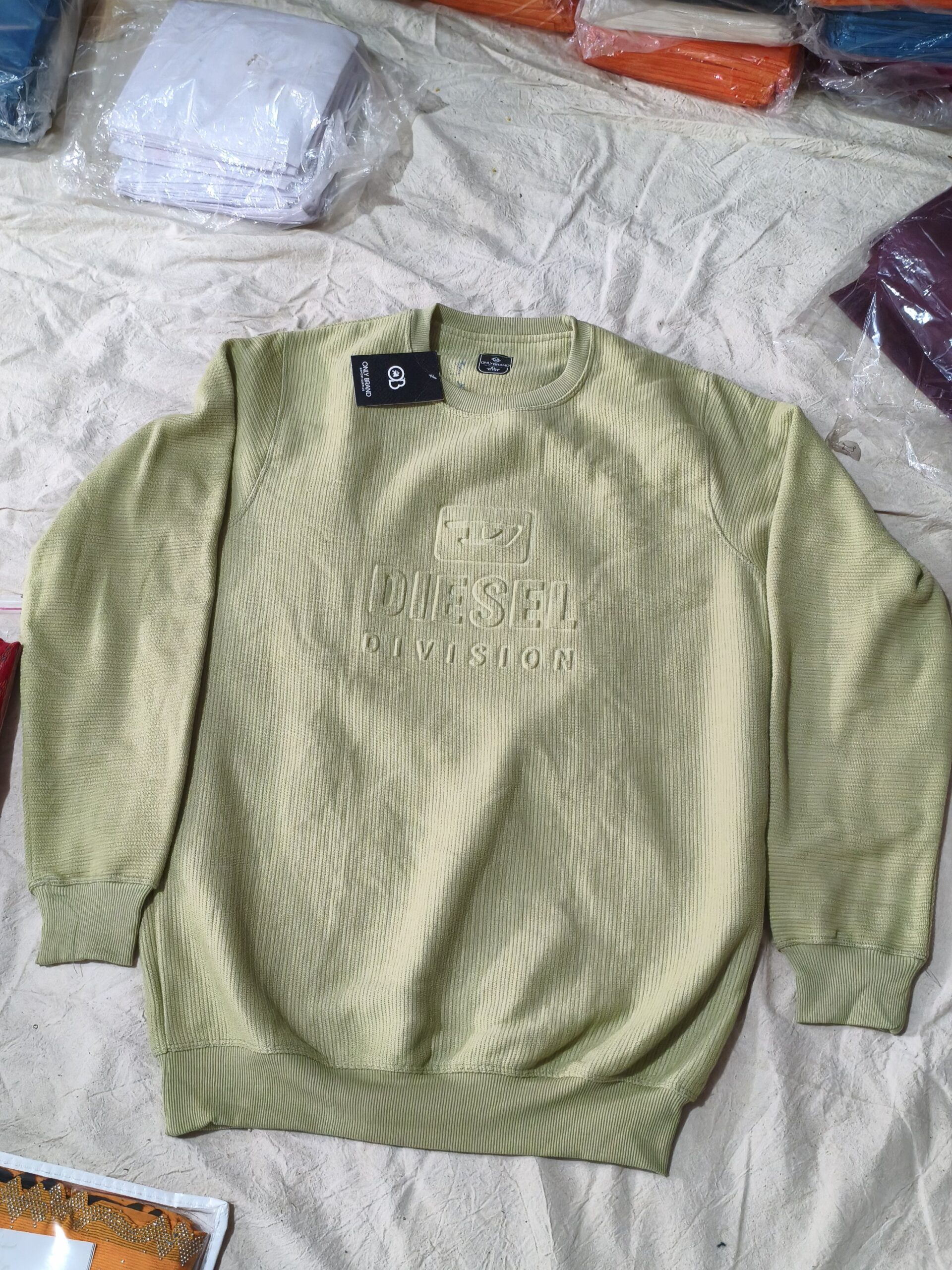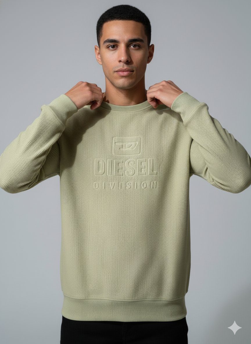 Stay warm and stylish with this light olive woolen sweatshirt. Made from soft, cozy fabric for ultimate comfort, it features an embossed Diesel Division logo for a premium look. Perfect for winter casual wear, this full-sleeve woolen T-shirt pairs effortlessly with jeans or joggers.