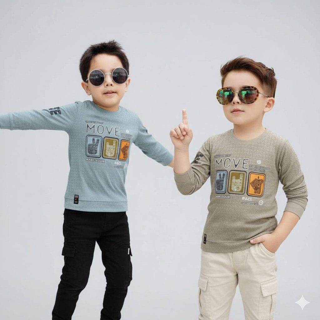 Discover the MOVE graphic full-sleeve t-shirt for boys. This stylish, breathable cotton blend top features a unique “Move Your Pace” hand-signal design. Perfect for casual, all-day comfort and easy styling. Shop the blue and olive green colors now!
