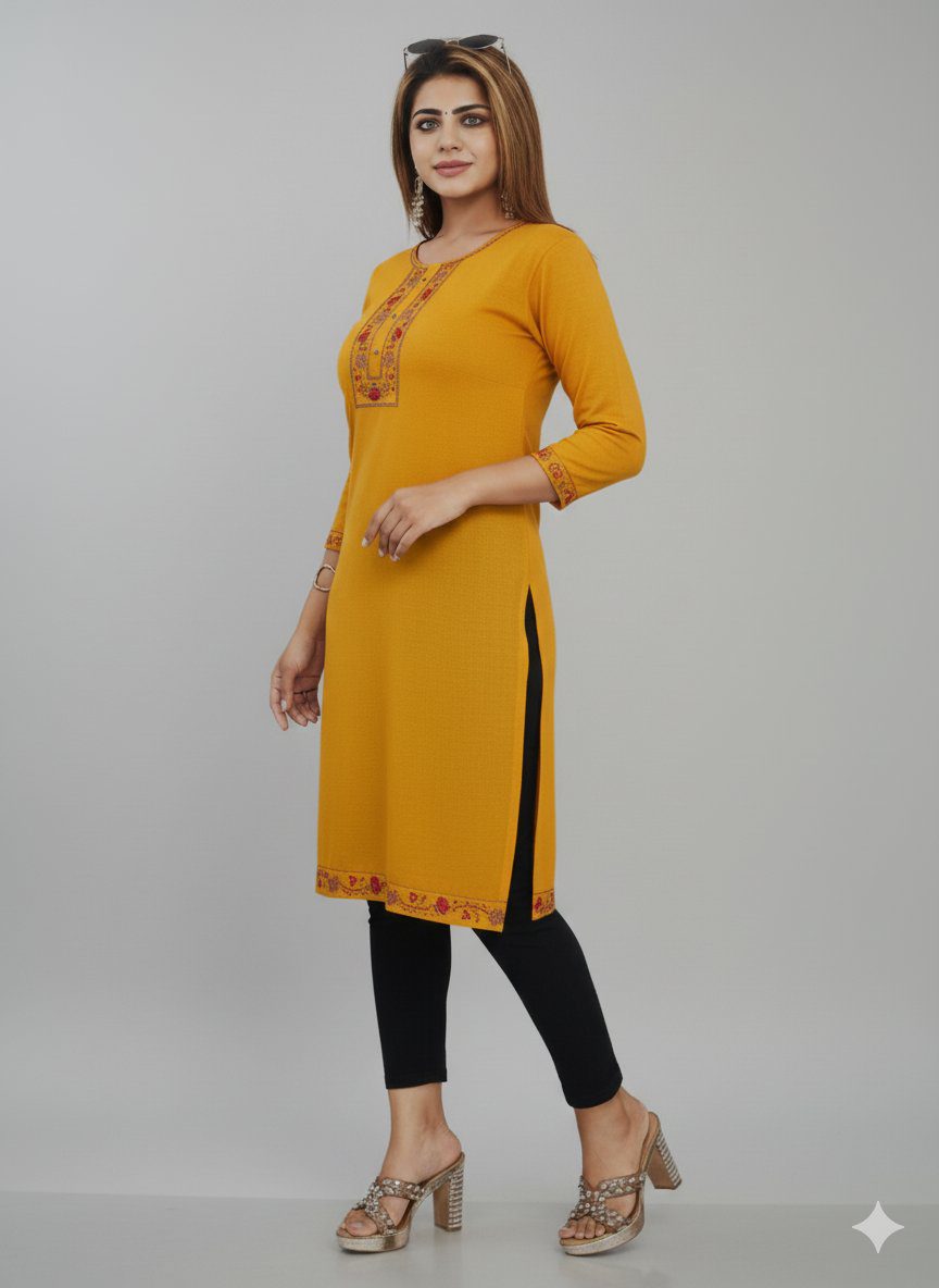 Elevate your ethnic collection with this stunning Mustard Yellow Straight-Fit Kurti. Featuring intricate red and pink embroidery on the yoke and hem, this 3/4-sleeve kurti offers a blend of traditional charm and modern style. Perfect for daily wear, casual outings, or office attire. Pair it with black leggings for a complete, elegant look. Comfortable and chic.