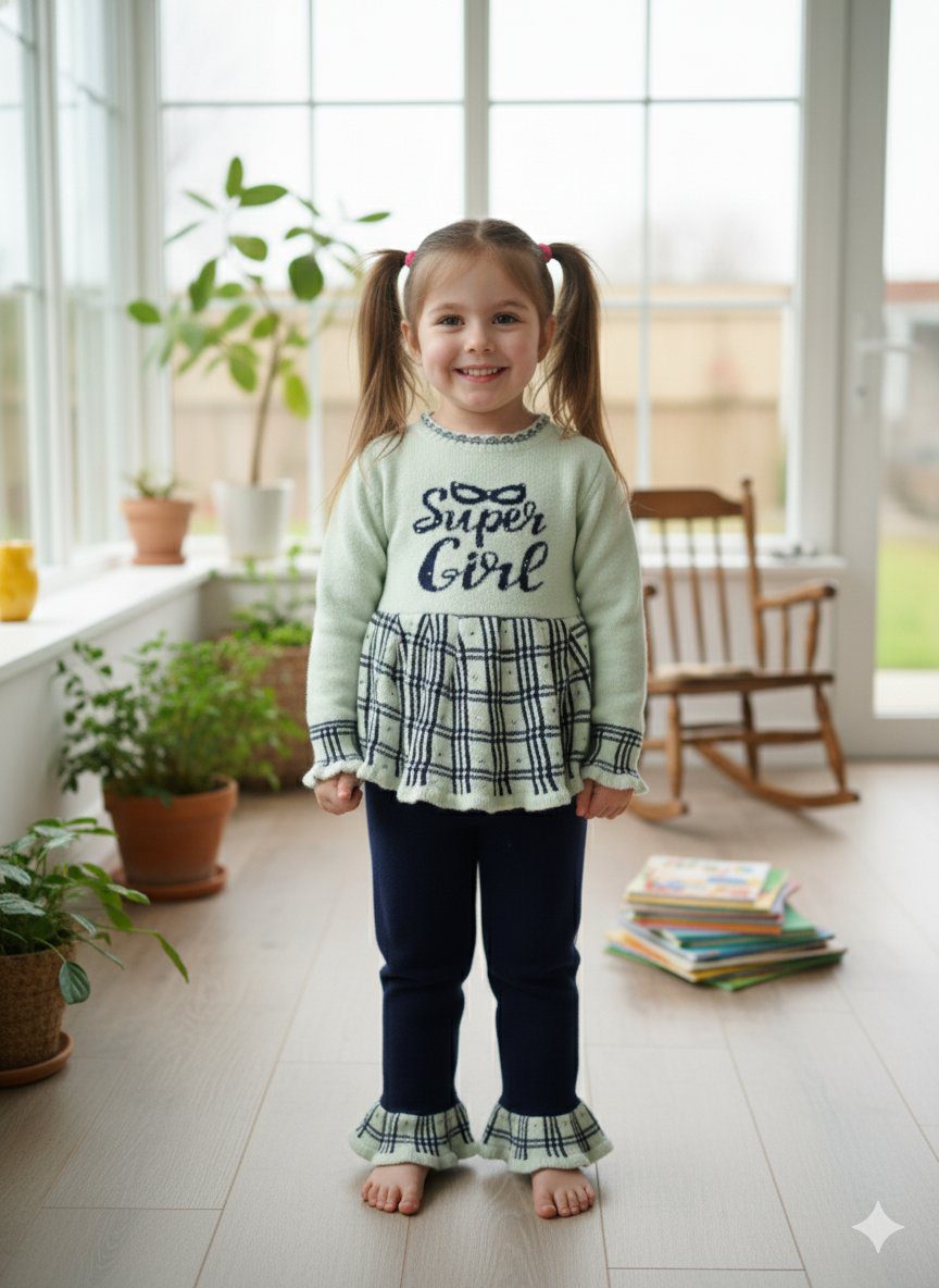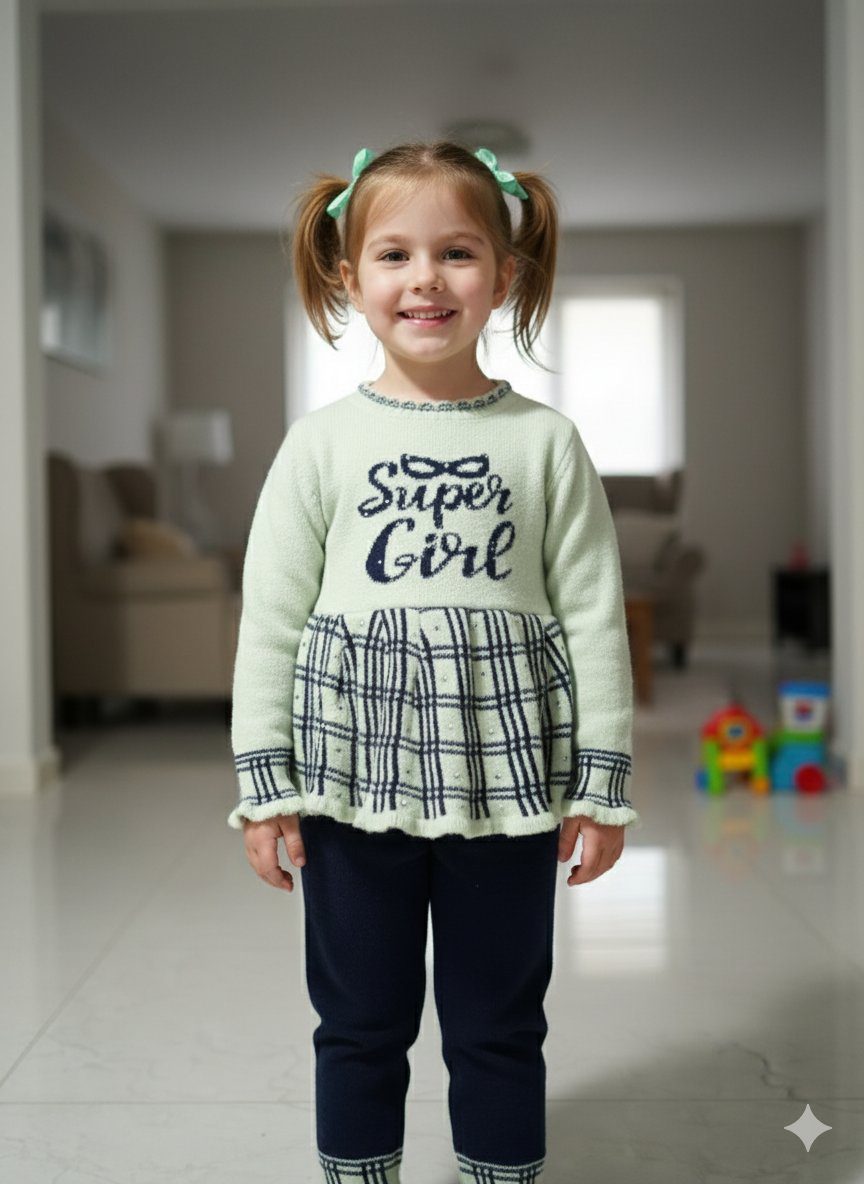 Cute "Super Girl" Knitted Set for Kids | Mint Green Peplum Sweater & Navy Leggings