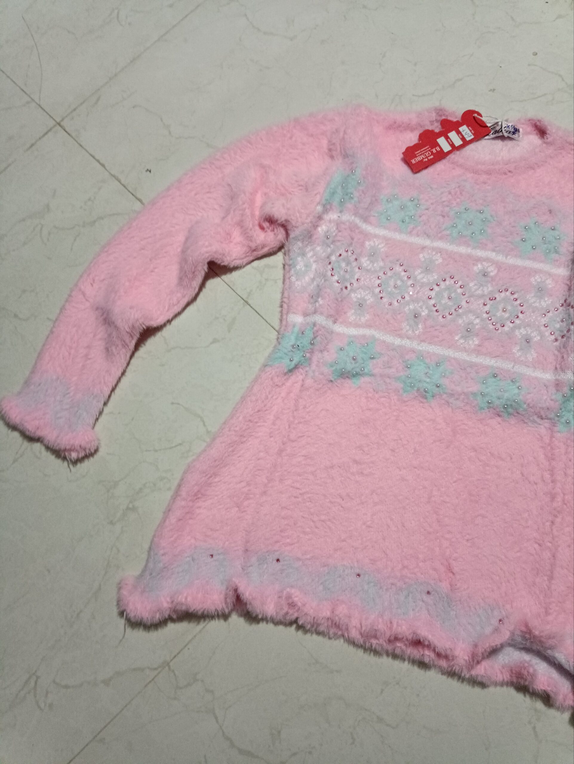 Delight your little one with this ultra-soft, pastel pink fuzzy sweater dress! It features a beautiful central panel of light blue and white floral snowflake patterns, adding a touch of whimsy. This cozy, tunic-length pullover is perfect for keeping warm while staying stylish during the colder months