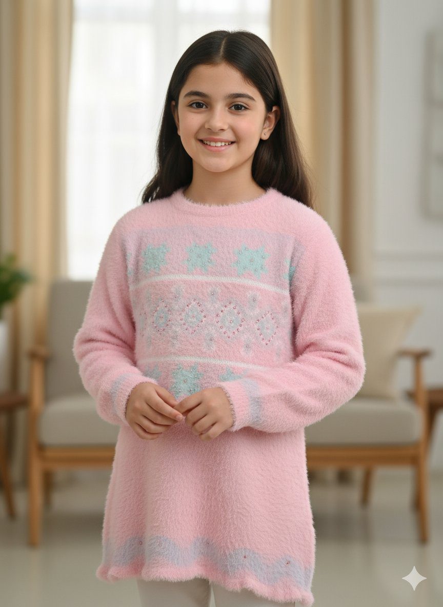 Soft Pastel Pink Fuzzy Sweater Dress | Girls' Floral Snowflake Tunic