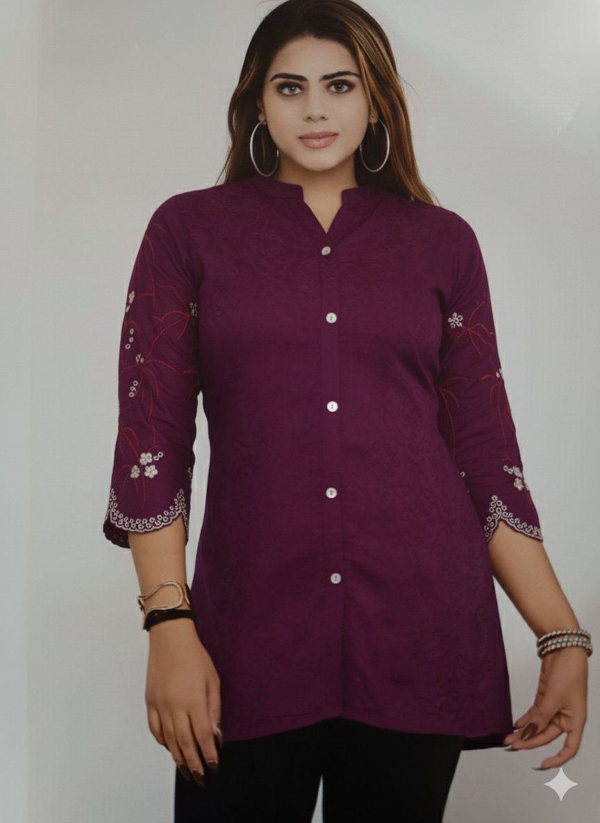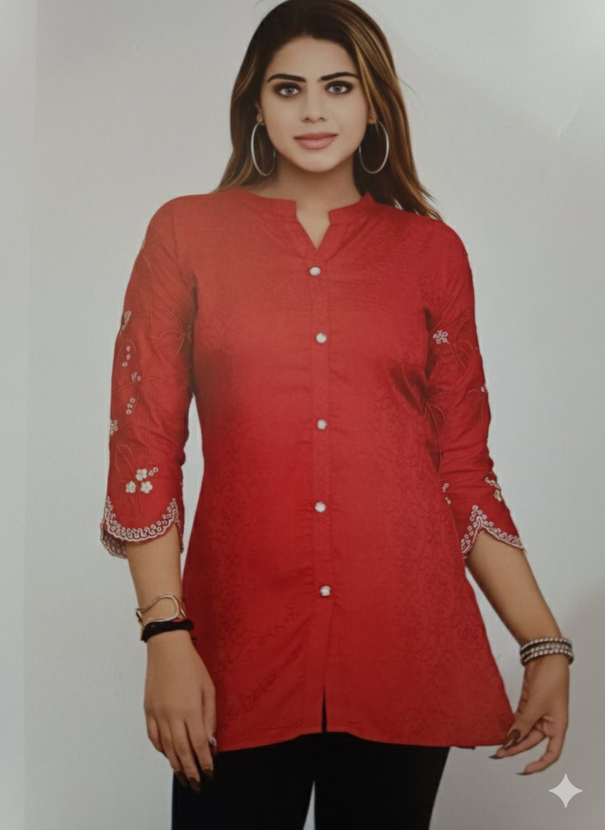 Elevate your style with our vibrant red tunic, featuring exquisite embroidery on the sleeves. This eye-catching top offers a modern design with traditional charm, perfect for celebrations or a chic everyday look. Experience comfort and elegance combined!