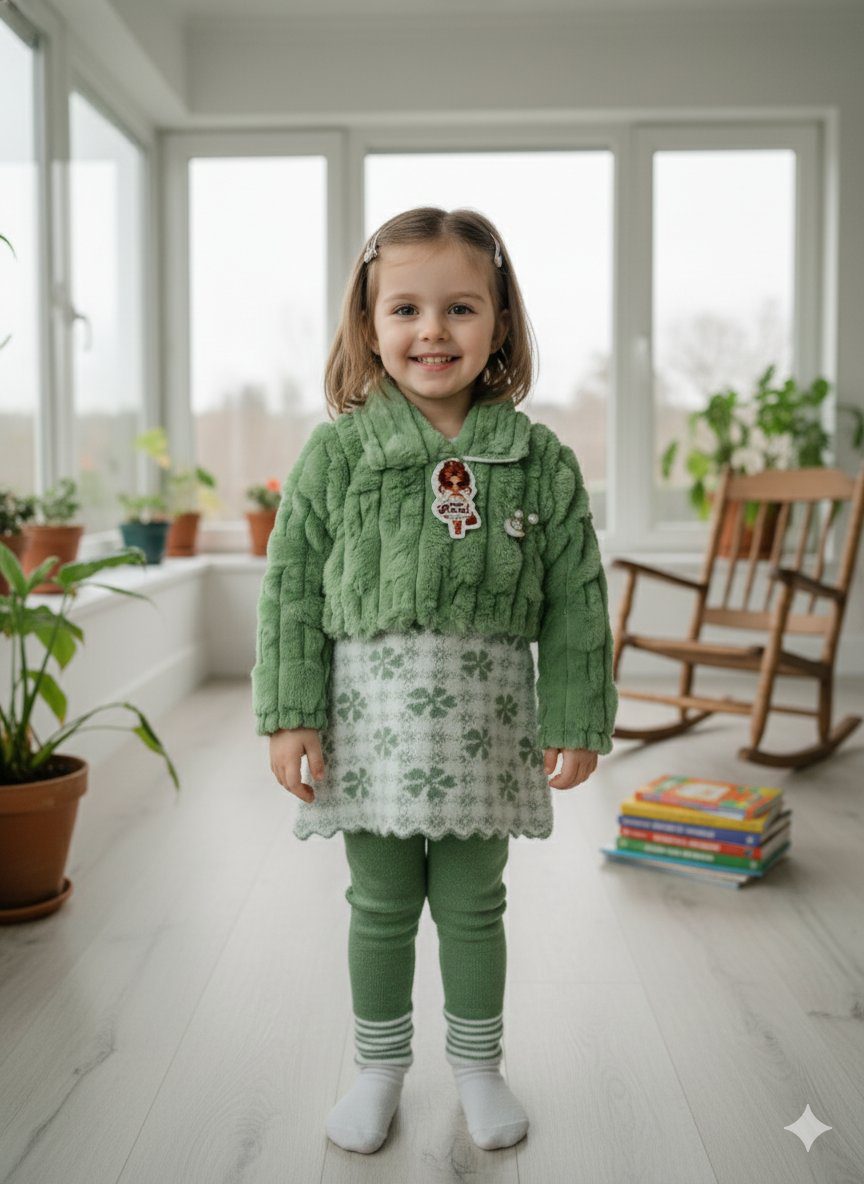 This charming image features a radiant young girl, full of joy and dressed in an adorable, cozy, and stylish outfit. She wears a vibrant moss-green cropped faux-fur jacket with a delightful textured finish, paired with a sweet white and pale green patterned knit skirt featuring a delicate scalloped hem. Completing her look are comfortable green leggings and white socks, ready for any adventure. Her bright smile and the playful patches on her jacket add a touch of personality to this sweet ensemble. The setting is clean and bright, allowing the vibrant colors and textures of the clothing to shine, making it perfect for capturing childhood innocence and fashion.